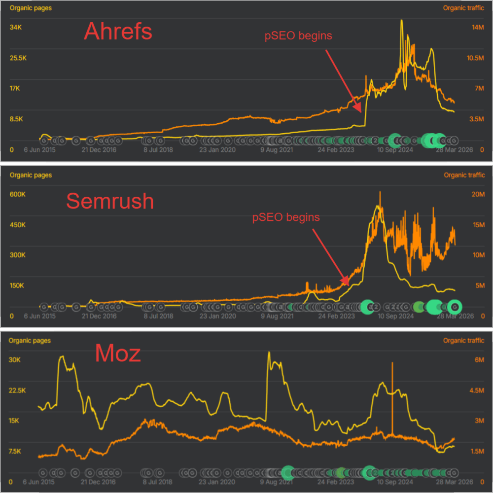 Suman Chatterjee compares Semrush, Ahrefs and Moz over several years of estimated traffic, ranked page counts and top-performing URLs, arguing that these pSEO case studies are often grouped together too loosely. His analysis says Semrush's long rollout of domain profile pages targeting low-difficulty navigational brand queries produced a far more durable outcome than Ahrefs' later push into writing tools and site profile pages, while Moz's steadier editorial growth offers a useful control. The most important point is that the same programmatic SEO label covered very different keyword targets, rollout speeds and page types, which led to very different levels of stickiness after Google's recalibration.