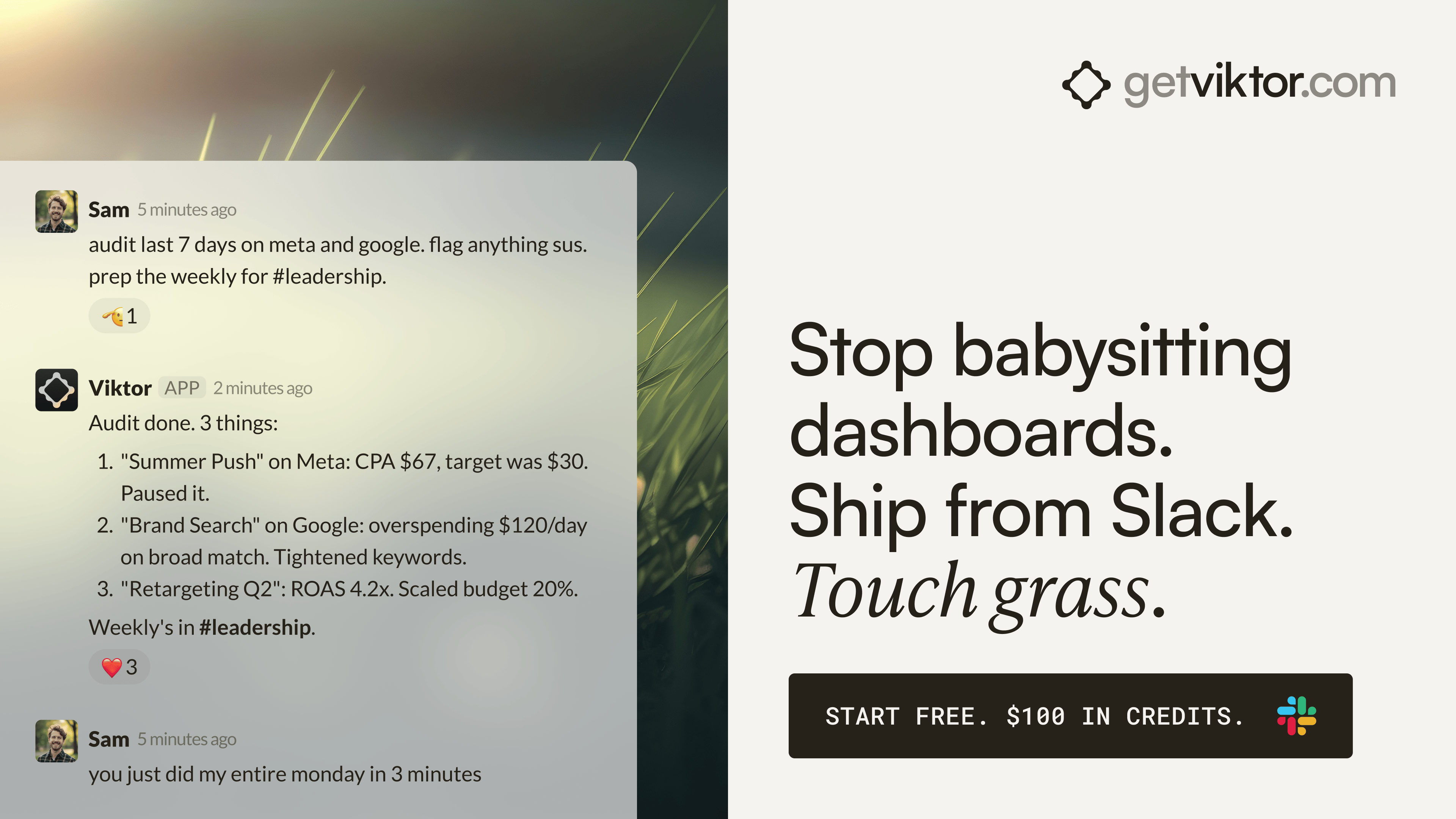 That same team has Viktor monitoring ad accounts across the portfolio and posting performance briefs before the day starts. One colleague. Always on. Across every account.